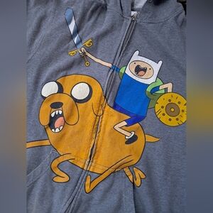 Gray hoodie featuring Adventure Time characters. Full zip front. Comfortable and stylish.