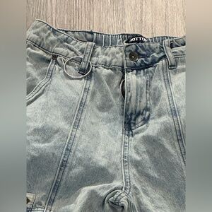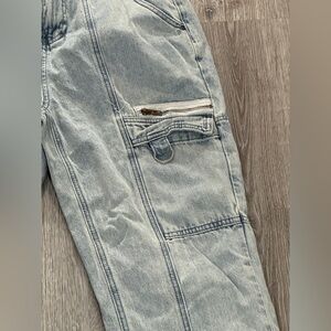 Trendy light blue cargo jeans with ankle cuffs. Features multiple pockets for utility.