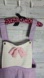 Charming purple pinafore dress featuring a white bodice and a cute pink bow. Perfect for a playful and stylish look.
