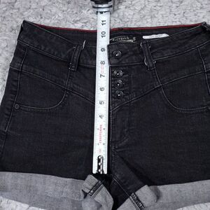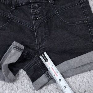 Women's Hot Topic Lovesick "The Short" jean shorts in black stretch denim. Rolled, cuffed or folded hem. There is light fading and washwear throughout (examples shown in photos) and pilling on the inside pockets as shown in photo. Style number 10219657. Size 5 in juniors sizing. Real measurements shown in photos with shorts laid flat: