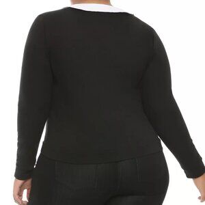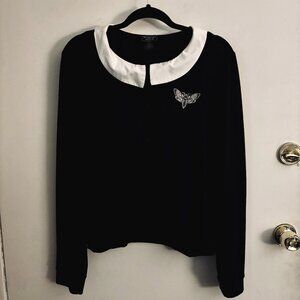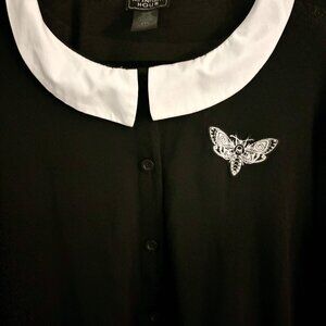 Hot Topic Midnight Hour brand plus size collared black cardigan. Full front-button closure, white collar and embroidered moth on the left chest. Size 2X