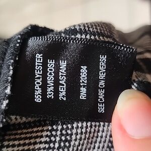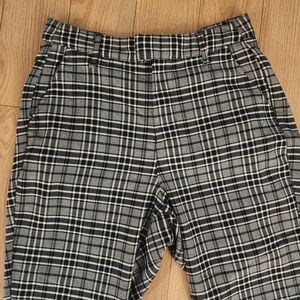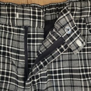 Pre-loved Hot Topic Plaid Pants. Size Small (unisex) with a stretchy waist band at the back, see measurements. High Rise. Ankle length if youre taller than 5'5. Black and white plaid. Tapered Chino style pants. Has front and back pockets along with belt loops. Zipper and hook with button fly. Polyester, viscose, and elastane.