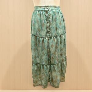 Tiered midi skirt, featuring an allover toss of Scottish thistles, Celtic knots, the Outlander crowned thistle logo, etc. Buttons down the center and an elasticated waistband in the back. This skirt has two ruffled tiers, with a chiffon layer on top and slip lining underneath.