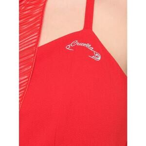 Set the room on fire, darling. Inspired by the striking red dress worn by Cruella, this number will be sure to serve sass and class. It has a mock neck drape detail in the front in crinkled satin that blends into the skirting. The bodice has adjustable straps, sweetheart neckline and princess seams. There is also "Cruella" embroidered on the left in metallic silver. Side slit and back zipper closure. Adjustable tank straps.