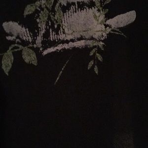 Black chiffon hi-low tank with tails and floral ribcage print. There are two nigh-invisible runs (pictured) that I would not have noticed had I not felt for them. No holes, rips, or tears. There is a small white mark below the spine (pictured) that feels like it’s a part of the print, but I don’t know because I’ve never seen another one of these. Bought from another posher and only wore it once. It’s just not my style anymore.