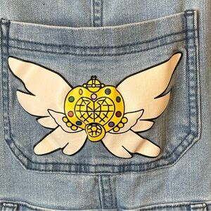From Sailor Moon, these shortalls feature a print of the Eternal Moon Article on the front bib pocket, and an embroidered crescent moon and heart on one leg.