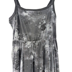 Take your love of Star Wars to the maxi! This dress featuring a starfighter galaxy printed mesh maxi over a solid black shorter slip.
