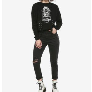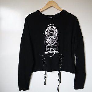 Feeling mystical, witchy, in sync with the universe? Make your sweatshirt match with this one! Printed on the front with a floral, geometric design, with silver foil accents. The hem features 2 lace-up sections with silver-tone grommets on the front and a raw edge.