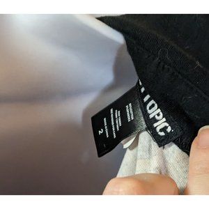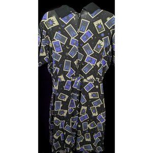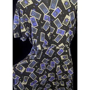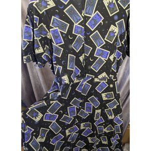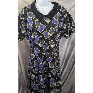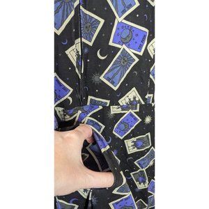 Super cute tarot polo dress by Hot Topic. It's made of a soft, stretchy black fabric, with blue and white tarot card print. It has small moon and star accent print between the cards in blue, white, and grey. It has a black fold over dollar, and a zip back with a hook closure at the top. It has a skater style skirt that's nice and flowy. This dress is super cute, and has a spooky, witchy feel. Great paired with tights or leggings, and a pair of boots!