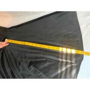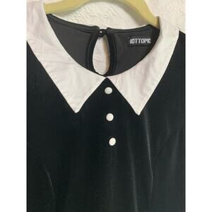 Black velvet Fit and Flare dress with a white collar and three front decorative buttons. Keyhole back with single button closure. No stains or blemishes. No size or material tag. I have included several measurements. Based on the Hot Topic website this is between a small/medium however please refer to measurements for best sizing/fit.