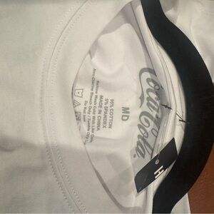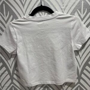 White crop top with red Diet Coke logo. Short sleeves. Casual and trendy.