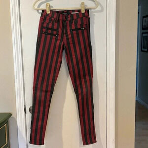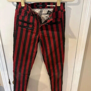These Hot Topic pants with Black Heart label style stringerette are a size junior girls 1. The pants are a skinny style and are a dark red and black stripe with black zippers giving the pants an edgy punk vibe. The back of the pants have 2 pockets. The pants are in good condition with no rips or stains and come from a smoke free home.