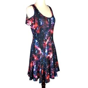 Hot Topic space dress cold shoulder fit and flare skater printed poly spandex S