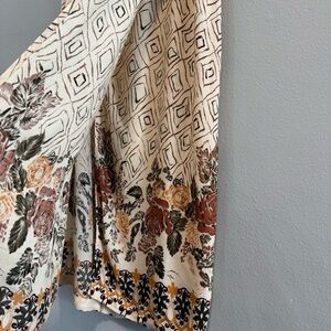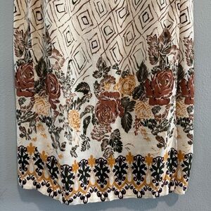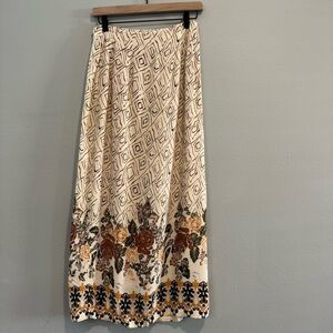 This elegant maxi skirt features a beautiful blend of floral and geometric patterns. The cream base is complemented by intricate designs in brown and orange hues. Perfect for adding a touch of sophistication to your wardrobe.