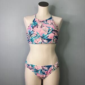Hot Water Pink Tropical Floral High Neck Halter Tie Bikini 2 Piece Set Size L. Tie back high neckline halter style bikini. Boning in the sides for structure. Removable pads. Open loop side detail on the bottoms.