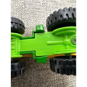 This vintage die-cast toy tractor front loader from Hot Wheels, manufactured in 1991, features a vibrant green and yellow design. It's a collectible piece for enthusiasts.