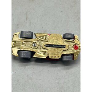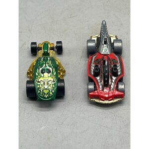 This collectible Hot Wheels 2002 Coupe features a striking green and gold design with a face painted on top and red wings on the side. Perfect for car enthusiasts and collectors alike.