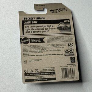 Bring classic lowrider energy to your collection with this Hot Wheels 2025 ’59 Chevy Impala from the Layin’ Low series. This bold red cruiser is 2/5 in the subseries and Mainline 44/250 for the year. Features custom low stanced styling, detailed side graphics, and a clean chrome finish.