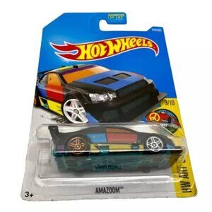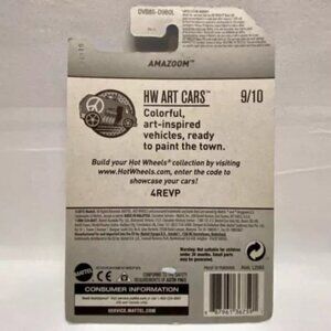 Hot Wheels Amazoom 218/365 from the HW Art Cars series is a 1:64 scale diecast car in black with multi-color graphics. It was manufactured in 2015 in Malaysia. This limited edition vehicle comes in an unopened box. The Amazoom model is part of the Hot Wheels brand and is recommended for ages 3 and up. It is part of the HW character family, suitable for boys and girls aged 3-Adult.