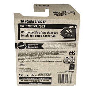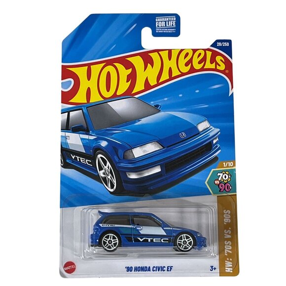 Hot Wheels 1990 Honda Civic EF from the 70s vs 90s fan-voted series. Features classic blue finish with VTEC graphics. #28/250 mainline, 1/10 in set. A nostalgic favorite for JDM and Honda collectors. New on card.