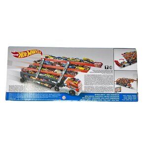 Easy and fun to load then haul your Hot Wheels vehicles! The massive Mega Hauler can carry more than 50 cars in its expandable levels. There are even more great features that make this big hauler mega unique— connect to Hot Wheels orange track and roll your cars onto a side-by-side race.