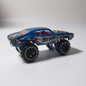 This collectable Hot Wheels Olds 442 Die Cast Daredevils car model comes in vibrant blue and yellow, without a box. Vintage and highly sought-after, it's made from durable metal and plastic.