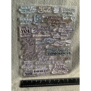 Ideal for card-making, scrapbooking, and crafting, this sheet of clear rubber stamps features various heartfelt sentiments and phrases.