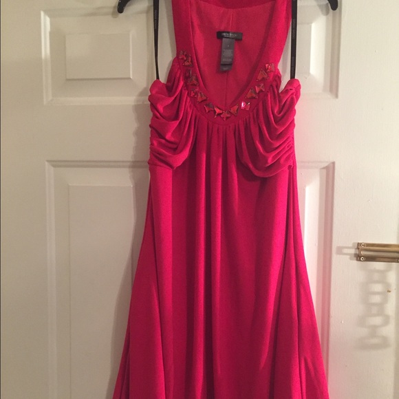 Hot pink dress, stops right above my knee (I'm 5'8 1/2), colored gemstones around neckline. Only worn once or twice! Smoke free and pet free home.