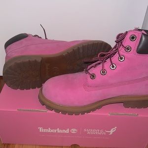 Hot pink breast cancer timberlands. Worn once,with box included. Very comfortable and good in all types of weather.