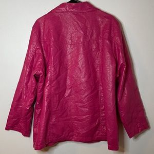 Super chic and so legally blonde vegan crinkled thin leather hot pink magenta crinkled leather with a shiny metallic sheen. The collar is exaggerated and pointed with three shiny pink buttons down the front. There are two wide pockets with pointed flaps on the tops. It’s long sleeved and calls below the waist depending on height. It can be worn oversized for a street style super trendy fun look or fitted with worn open or buttoned. It’s so chic and so much fun! It’s vintage I’m assuming from the seventies from my research. There’s a pink canvas polyester lining but lightweight and so fun and extra glam! Perfect for a girly girl like me!