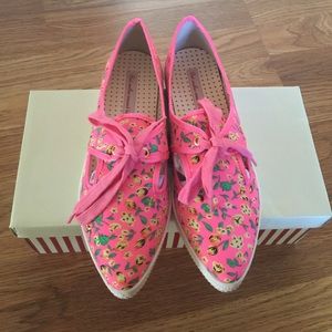 These hot pink shoes are so much fun! Even though they are tennis-shoes they are perfect for summer because of the open slots at the top of shoe. Brand new!