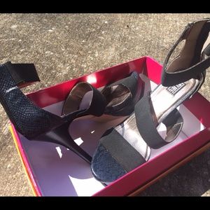 Never worn! Look very sexy on, just make me too tall! Hah...has 3 bandage straps that go up to around the ankle so they feel pretty stable and the snakeskin accent & platform spices them up even more!!