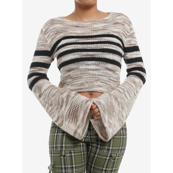 Feel cozy in this comfy, cropped sweater! This cream and tan sweater comes with black stripe detailing and bell sleeves.