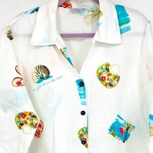 Vibrant button-up shirt with beach-themed prints. Features a mix of blue, red, and green colors on a white base.55% Linen 45% Cotton Size XL Approximately measurement:shoulder 18”/pit 26”/sleeve 20,5”/length 29” Pre-owned excellent condition