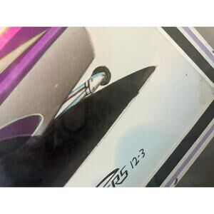 This striking original illustration by automotive artist David Teters showcases a wicked custom concept truck done in bold metallic purples, silvers, and neon accents. The exaggerated low-slung body, oversized drag slicks, racing scoop, and sweeping flame graphics make this a standout piece for anyone who lives and breathes hot rods, drag builds, or custom truck culture.