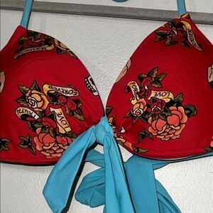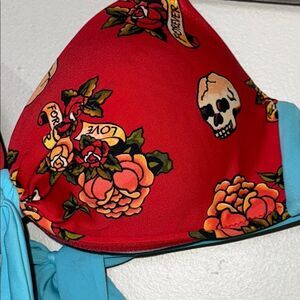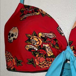 Stylish old school tats swimsuit top from Hot Topic. Perfect for a bold look.