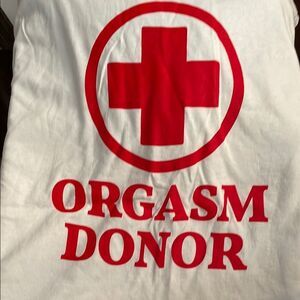 Bold graphic tee with red cross and text. Comfortable short sleeves. Perfect for casual wear.