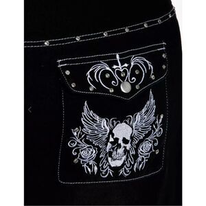 It's all in the details! Glam up your look with this black, denim mini skirt! Featuring white contrast stitching and rhinestone detailing throughout. Comes with front pockets, plus back pockets with heart, skull, rose and filigree designs embroidered in white.