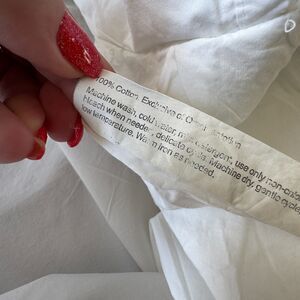 This is a pre-owned set of shams in good pre-owned condition. It includes 2 standard size shams and 1 Euro sham - perfect for accent! They are made with crisp white cotton by Hotel Collection. They are trimmed in a double row of black stitching.