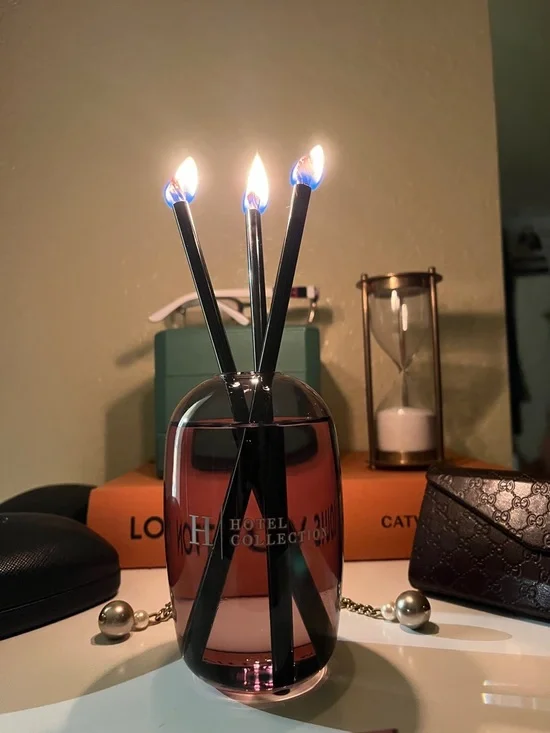 Sleek glass diffuser with contrasting black reeds. Emits soft ambient light and decorative flair. Stylish accent for tabletops or shelves. Elegant and modern design.