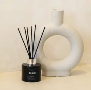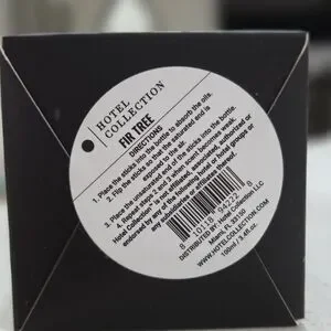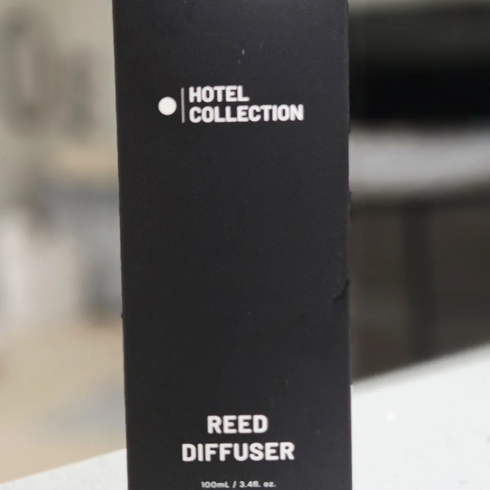 Hotel Collection Brand reed diffuser in sleek black packaging. Bold white logo and text. Modern, minimalist scent accessory.