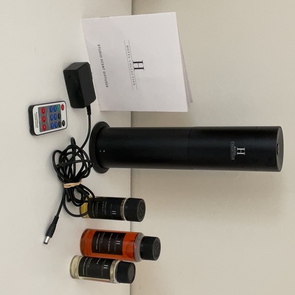 Elegant black scent diffuser with remote and essential oils. Perfect for creating a relaxing atmosphere.