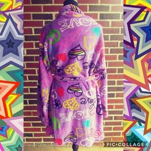 Coziness at its best....bold print with hearts, love, peace and flowers, machine wash cold, tumble dry low, 100% polyester, front pockets, NWT