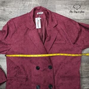 This charming Hotouch corduroy blazer, rendered in a vibrant red hue, is a contemporary luxury that awaits a lady of discerning taste. New with tags, this delightfully modern jacket, boasting four buttons and a blend of polyester and spandex, promises to add a genteel splash of colour and trendy comfort to your ensemble.