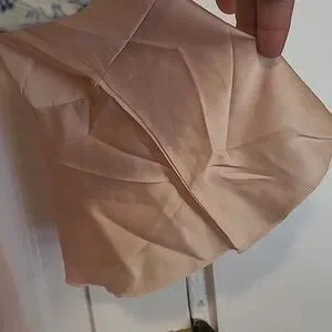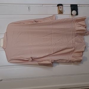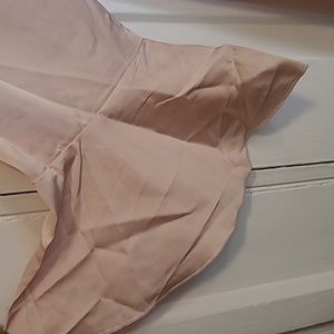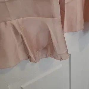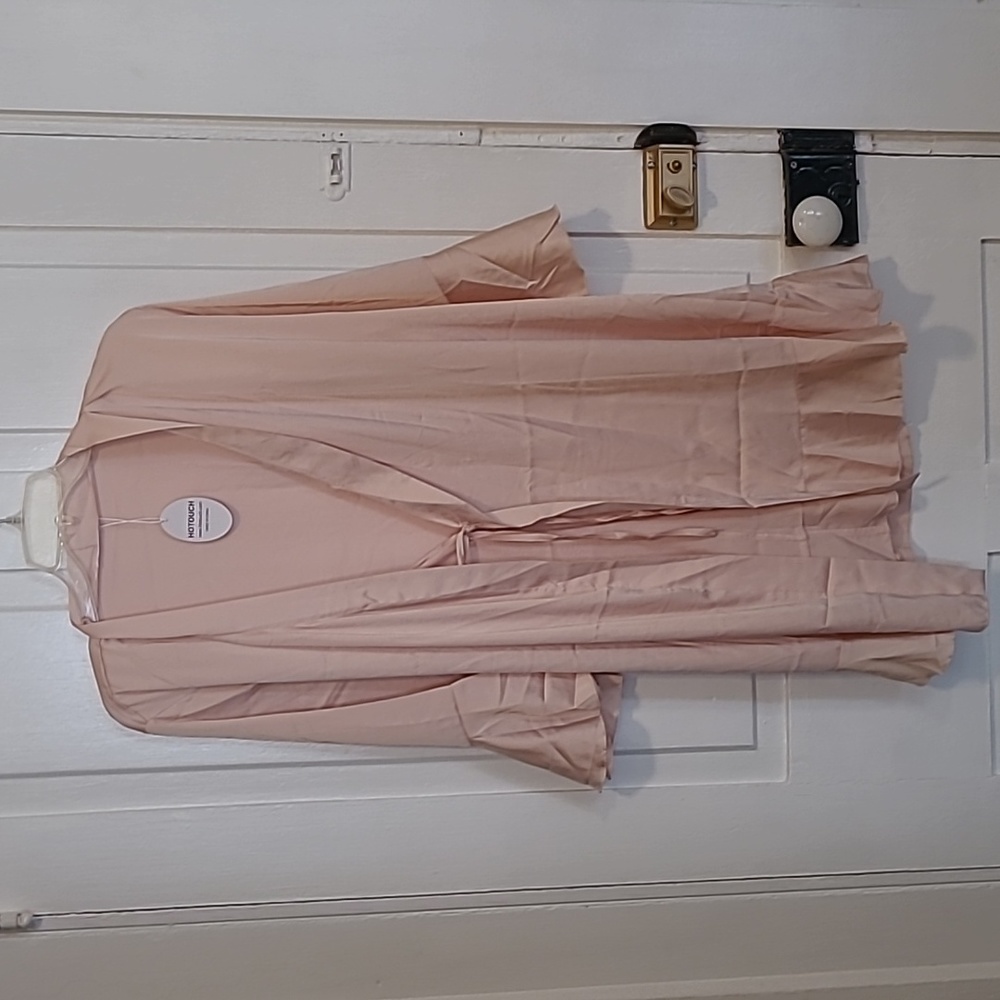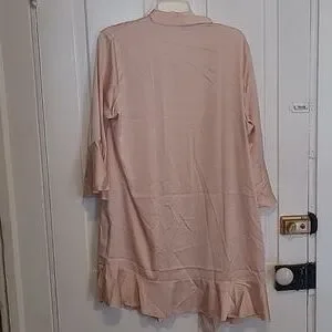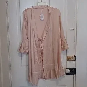 Beautiful silky like robe. Ties on the inside of the robe but the belt on the outside is missing. Flared ruffles on the bottom of the robe and on the sleeves. Very like pink/peach color.