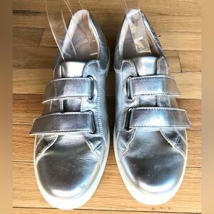Hotter brand leather sneakers tennis shoes bright silver “Skip” size 9.5. UK 40.