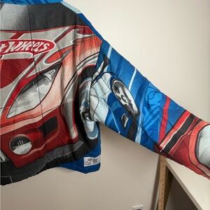 This is a one-of-kind custom Hotwheels puffer jacket. Handmade and Upcycled from a vintage comforter. Super soft worn in feel with stand collar and blue vinyl zipper front. Features single front chest pocket. Outside features vibrant Hotwheel car images with a fun lining with multiple racing themed graphics. Make a statement in this cool jacket. It will definitely grab attention and have people asking “Where’d you get that!” Fits similar to men’s large with cropped length but please see measurements below.