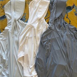 The ultimate sun protection! Great condition (I used once for a hiking trip, bought 3 as you can see). This one is the white color. The material drapes and is cool to the touch. This is NOT fitted. It’s meant to be big and flowy for air flow/cooling. Size M (but fits like S).