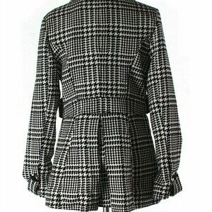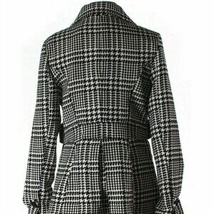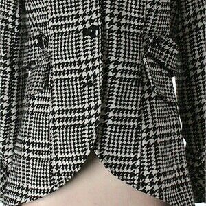 This coat it's warm, comfortable yet heavy in weight. Two front pockets and riders cut in the front. Polyester Acrylic blend. It's in excellent used condition but has an unnoticeable rip. It's not really a rip, but a thread that sticks out and can be cut off. Shoulder to shoulder is 16" Waist is 18", Hips are 21" Armpit to Armpit is 20" lenght in the front is 27". It's 30" in the back.