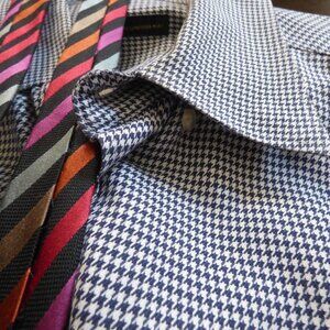 Houndstooth in Black & White, the fabric is not thin, it was made to last, which is just one of the attributes of Hart Scaffer Mark. Houndstooth pops when matched with the right tie like the black, red , etc Ben Sherman shown here.